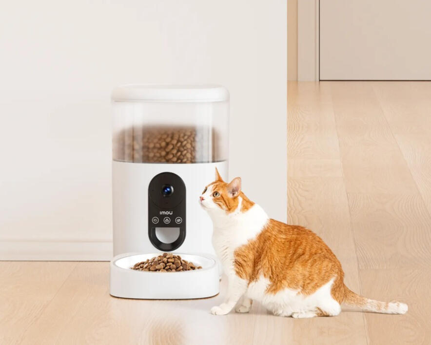 Imou PF1 smart pet feeder dispenses scheduled meals, 2.5K camera monitoring, 4L capacity, app control, two-way audio, anti-clog design, battery. πΆπ·